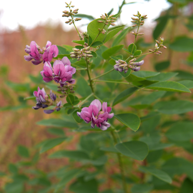 花期: 晩春から夏枝先に花茎を数本伸ばして穂状に小さな花が多数咲く。 花色は茶色や紫色。 花弁は旗弁のみで翼弁と竜骨弁は退化している。 葉は奇数羽状複葉。